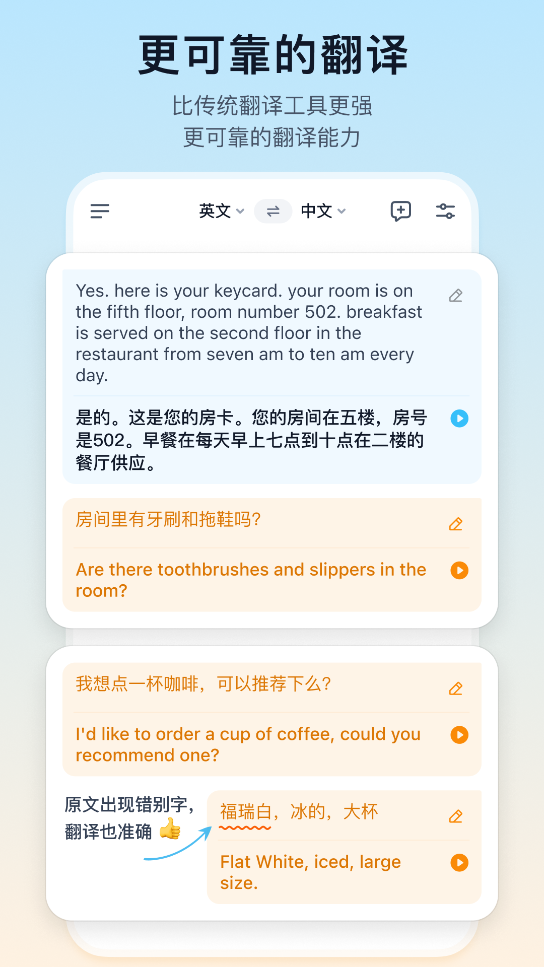 4、文本校准:除基础翻译功能外,翻译鸥还提供文本校对服务,协助用户修正语法和拼写错误