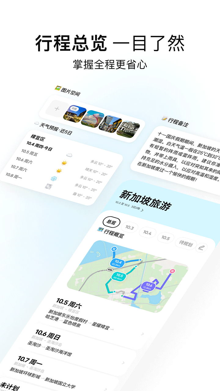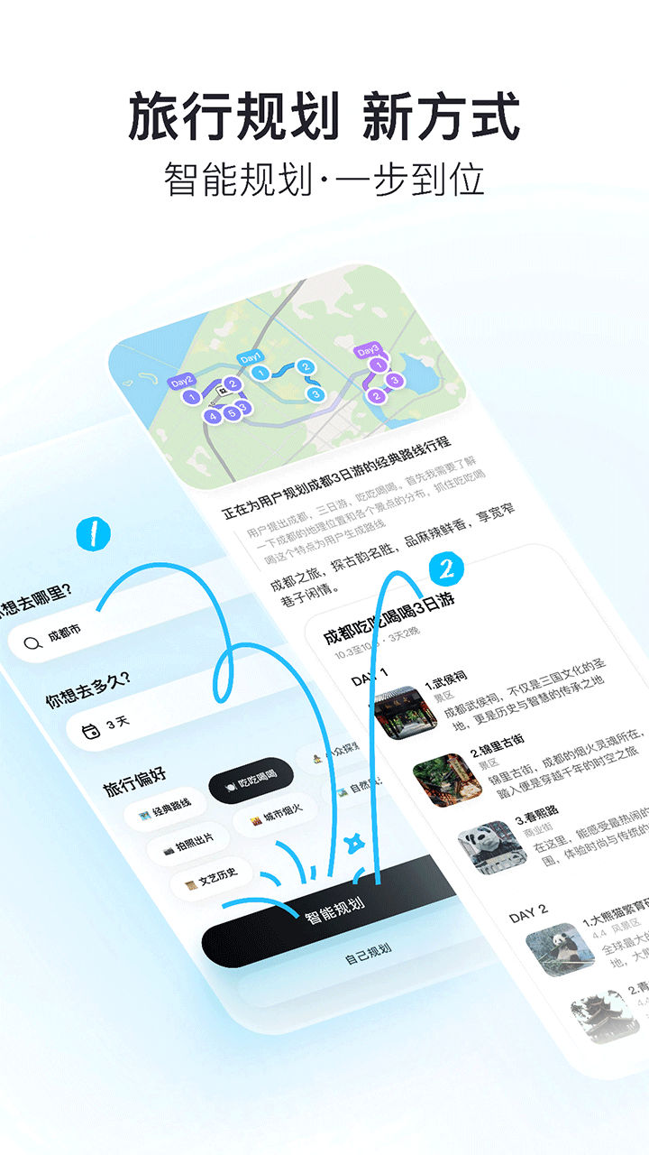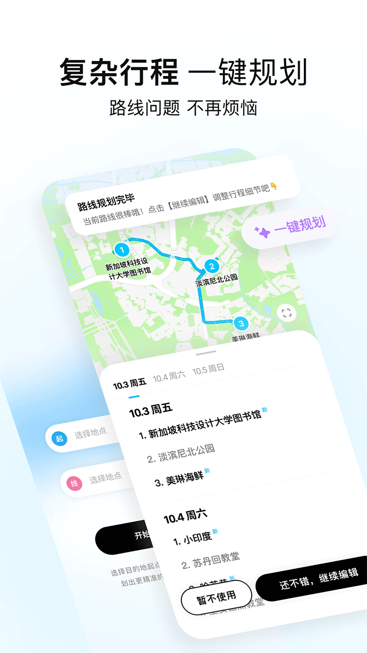2、智能引擎推荐游览顺序,整合地图与交通信息,行程更可行。
