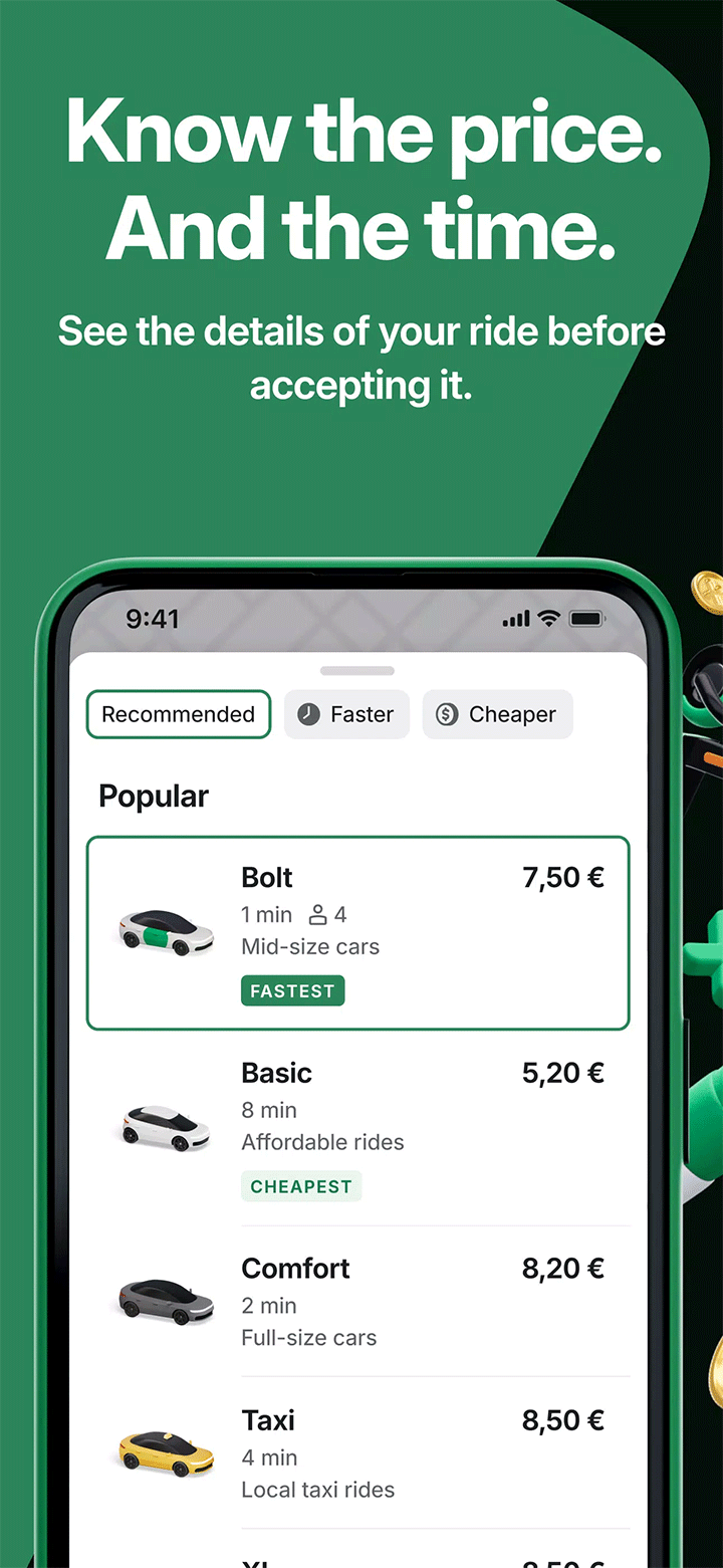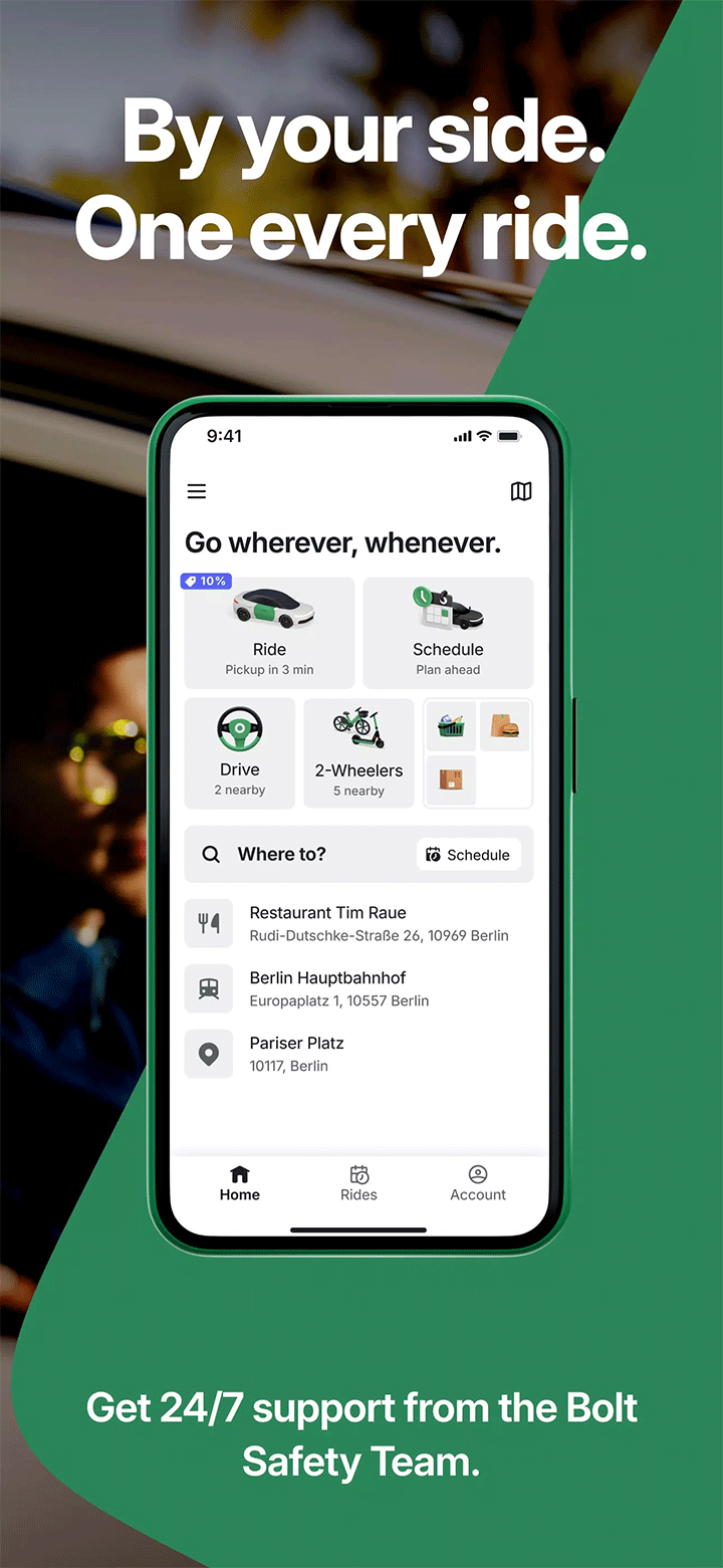 bolt打车这是一款适用于全球范围的综合生活服务平台,提供网约车、外卖配送等多种便捷服务。支持超过600个城市及50多个国家,涵盖叫车、预约出行、共享代步工具等多样化出行需求。用户可一键下单,系统快速匹配服务,提供行程追踪功能,确保出行过程安全可靠。