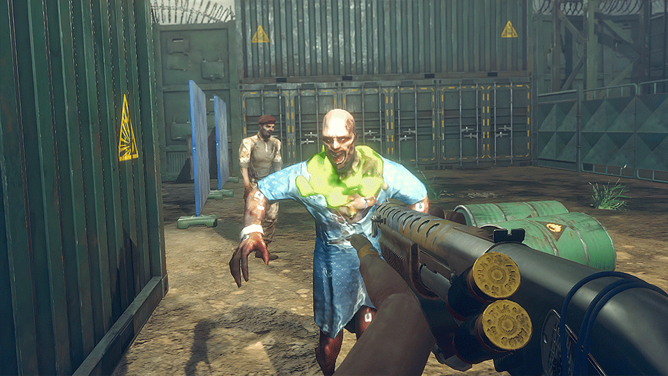 3、合理使用场景中的油桶,当大量僵尸聚集在油桶范围内时,射击油桶可一击清除多个敌人